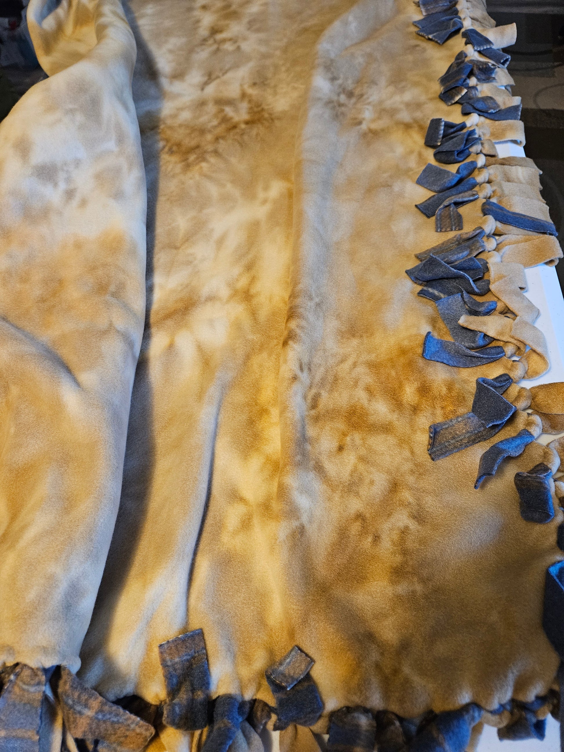 Crafted with meticulous attention to detail, this handmade hand-tied plaid blanket combines timeless style with functional warmth. Measuring 47" x 50", it's perfectly sized for draping over furniture or snuggling during cooler months. The sophisticated blueish-grey and brown plaid pattern with a tan marbled backing brings understated elegance to any room, making it an ideal accent piece for fall and winter décor. Each hand-tied knot reflects the artisanal quality and durability you'd expect from a carefully constructed textile. A versatile addition to your home that bridges comfort and design.